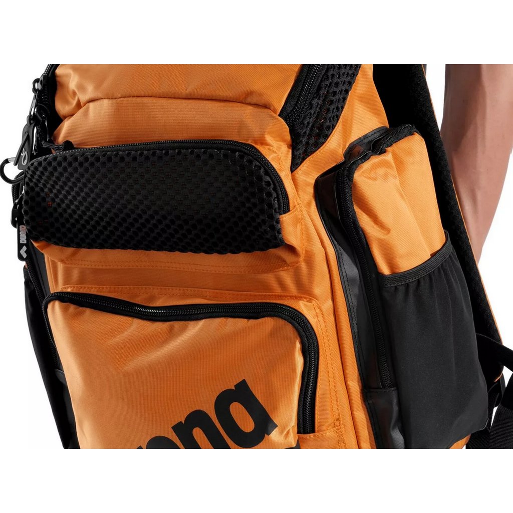 Batoh Arena One Go 45 má veľmi veľkú hlavnú komoru, ktorá sa doširoka otvára spoľahlivým a pevným zipsom. Umožňuje pohodlné uskladnenie aj väčších plaveckých pomôcok, ako je napríklad plavecká doska, šnorchel či plutvy, topánky, oblečenie alebo elektronika. Zároveň, vďaka vnútornej priehradke udržiava veci prehľadne zorganizované a usporiadané tak, aby bolo všetko na svojom mieste. Z prednej strany má batoh ďalšie dve vrecká - jedno sieťovinové, určené na uloženie napríklad mokrých plaviek po tréningu, a druhé väčšie vrecko na ostatné pomôcky, ako napríklad plavecké okuliare alebo pádla na ruky. Po stranách sú ďalšie dve uzatvárateľné vrecká na osobné premety a elastické držiaky na športové fľaše.